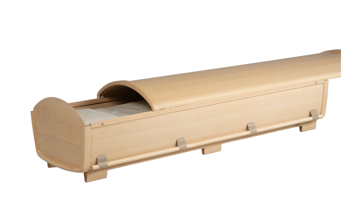 Kistan är tillverkad i oljad ask och har ett praktiskt skjutbart lock. Invändigt finner man en madrass, kudde och täcke i linnekvalitet. Den vackra bärstången i massiv ask har detaljer i rustik sadelgjord, vilket ger kistan en stilfull och naturlig känsla. Kistan är helt i trä och innehåller ingen metall, och tack vare den innovativa konstruktionen används betydligt mindre material än vid tillverkning av en traditionell kista.